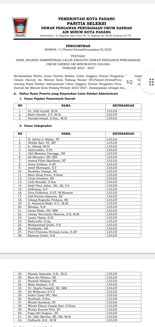PADANG — Proses seleksi calon anggota Dewan Pengawas (Dewas) Perusahaan Umum Daerah (Perumda) Air Minum Kota Padang periode 2023–2027 mendadak jadi sorotan tajam publik. Alih-alih menumbuhkan kepercayaan terhadap transparansi, hasil seleksi administrasi justru menimbulkan kecurigaan serius soal kelalaian dalam verifikasi berkas peserta.