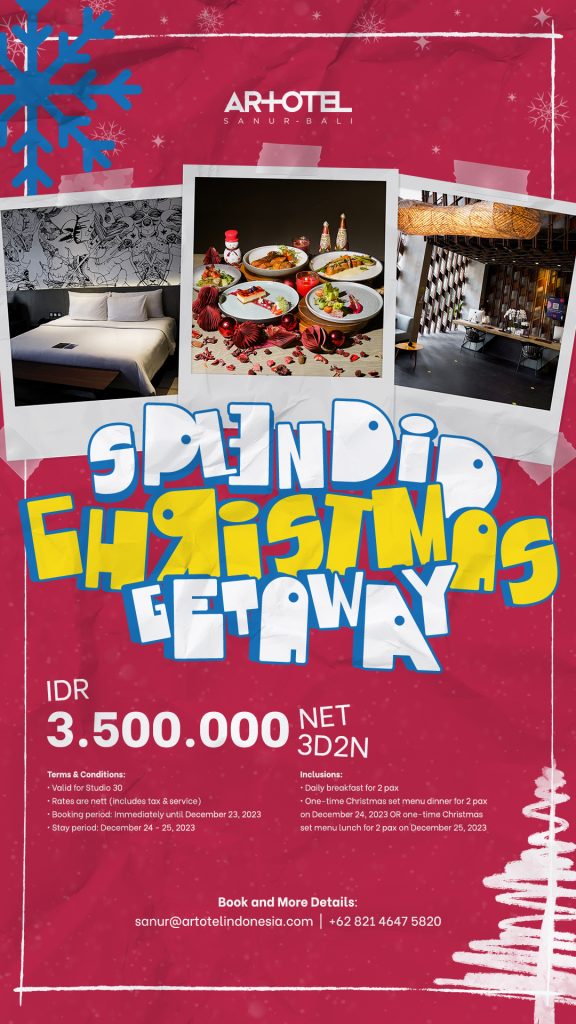 Ada Splendid Christmas Getaway. Ini adalah promo menginap 3 hari 2 malam yang dapat dinikmati oleh para tamu di ARTOTEL Sanur – Bali dengan harga Rp 3.500.000,- sudah termasuk sarapan pagi untuk 2 orang dan makan malam di malam Natal pada 24 Desember 2023 atau makan siang di hari Natal 25 Desember 2023 untuk 2 orang.