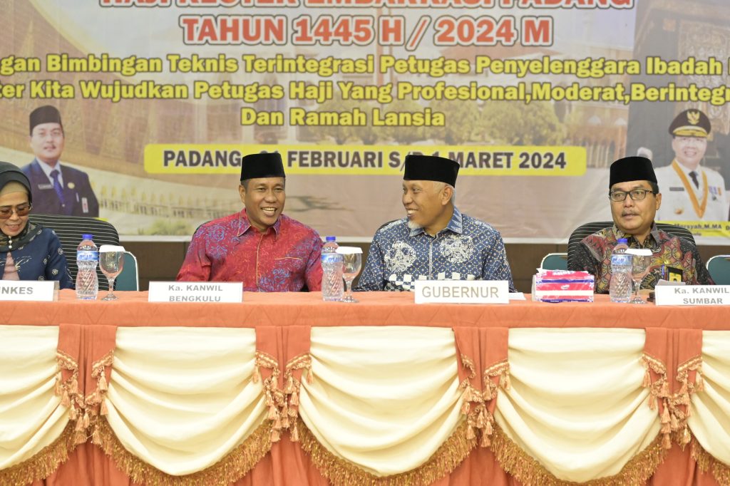 PADANG, PARADISO INDONESIA – Gubernur Sumatera Barat (Sumbar), Mahyeldi Ansharullah meminta Petugas Penyelenggara Ibadah Haji (PPIH) dan Petugas Haji Daerah (PHD) Kloter Embarkasi Padang, untuk profesional dan amanah dalam membimbing jemaah haji menuju haji yang mabrur. Hal itu disampaikan Gubernur saat membuka Bimbingan Teknis (Bimtek) bagi PPIH dan PHD Tahun 1445 H/2024 M, di Aula Makkatul Mukarramah Asrama Haji Embarkasi Padang, Kamis, (22/2/2024).