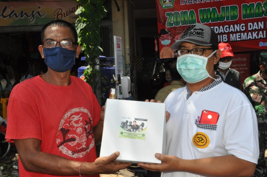 Kegiatan pembagian masker pada kesempatan ini dipusatkan di beberapa titik, diantaranya di Pasar Kediri, Pasar Tabanan, Pasar Dauh Pala dan Pasar Relokasi Dangin Carik, yang disebar untuk pedagang dan masyarakat sebanyak 10.00 masker dan 500 masker kepada petugas medis di BRSU Tabanan, RSU Nyitdah, dan Puskesmas II Tabanan.