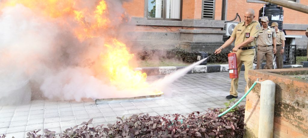 DENPASAR, PARADISO INDONESIA – Apel Peringatan Bulan Keselamatan dan Kesehatan Kerja (K3) Tahun 2024 digelar di Halaman Kantor Dinas Ketenagakerjaan dan Energi Sumber Daya Mineral, Senin (22/1/2024). Kadisnaker dan ESDM Bali Ida Bagus Setiawan bertindak sebagai inspektur dalam apel tersebut. Peringatan Bulan K3 juga diisi dengan demo pemadaman kebakaran dengan media APAR (Alat Pemadam Api Ringan). Kadisnaker dan ESDM Bali Ida Bagus Setiawan dan sejumlah pegawai secara bergantian mempraktikkan cara pemadaman api dengan menggunakan APAR.