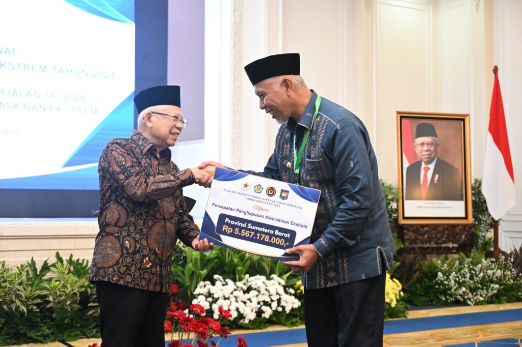Penghargaan tersebut diserahkan langsung oleh Wakil Presiden (Wapres) K.H. Ma’ruf Amin, selaku Ketua Tim Nasional Percepatan Penanggulangan Kemiskinan (TNP2K) kepada Gubernur Sumbar, Mahyeldi Ansharullah di Auditorium Sekretariat Wakil Presiden, Jl. Kebon Sirih No. 14, Jakarta Pusat, Rabu (18/09/2024).