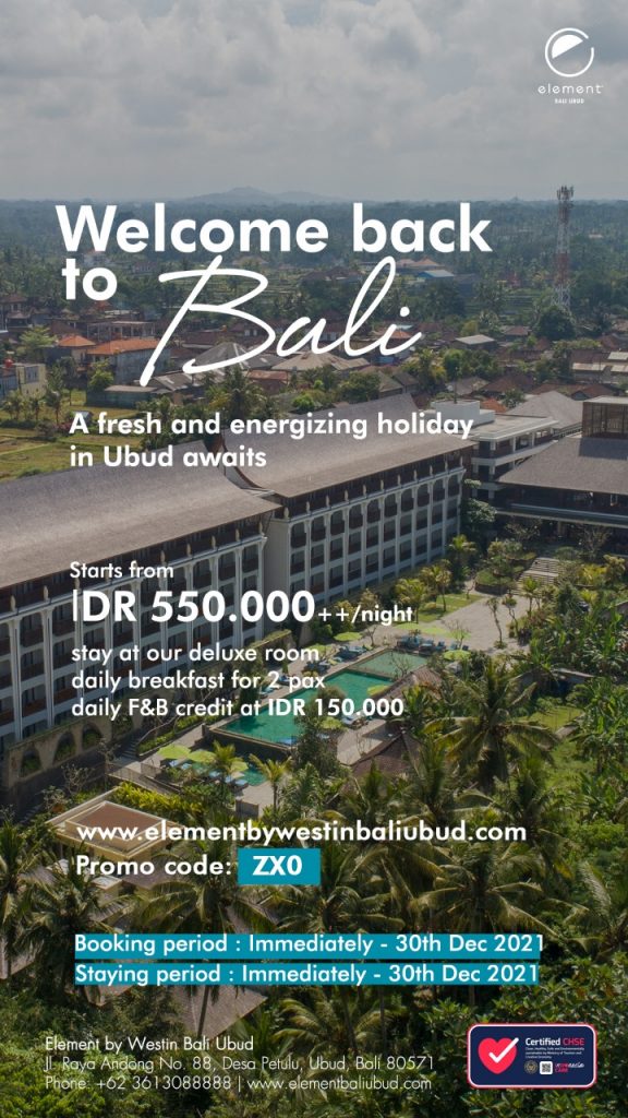 Dengan dibukanya Bandara International Ngurah Rai pada 14 Oktober 2021 lalu, Element by Westin Ubud pun menyatakan siap menyambut kembali wisatawan macanegara ke Bali. Hotel yang memiliki 152 kamar, dengan 1 ruang meeting dengan luas 170 m2 melakukan berbagai persiapan untuk merayakan berita baik ini, salah satunya dengan menghadirkan promo spesial yaitu “Welcome back to Bali”.