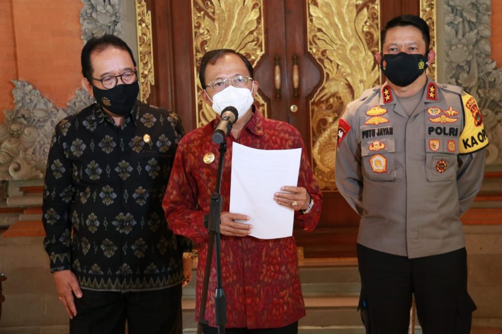 “Ketiga wilayah tersebut adalah Ubud, Kabupaten Gianyar, ITDC, Nusa Dua, Kabupaten Badung, dan Sanur, Kota Denpasar,” ujar Gubernur Koster yang didampingi Wagub Cok Ace, Sekda Provinsi Bali, Dewa Made Indra, Kapolda Bali, Irjen Pol Putu Jayan Danu Putra, dan Kasrem 163/Wirasatya Kolonel Inf. Ida Bagus Ketut Surya Widana saat membacakan Surat Edaran (SE) Nomor 06 Tahun 2021 tentang Perpanjangan Pemberlakuan Pembatasan Kegiatan Masyarakat Berbasis Desa/Kelurahan Dalam Tatanan Kehidupan Era Baru di Provinsi Bali dan Peraturan Gubernur Bali Nomor 10 Tahun 2021 tentang Penerapan Disiplin dan Penegakan Hukum Protokol Kesehatan Sebagai Upaya Pencegahan dan Pengendalian Corona Virus Disease 2019 Dalam Tatanan Kehidupan Era Baru di Gedung Gajah, Jayasabha, Denpasar, pada Selasa, Anggara, Wage, Gumbreg (9/3).