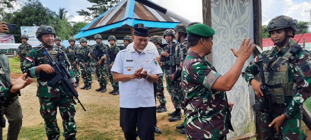 Usai diskusi dengan Forkopimda PBD, Gubernur Mahyeldi bersama Forkopimda Sumbar menunaikan janji kepada pasukan Satgas Yonif 133/YS, untuk melihat langsung kondisi prajurit pengamanan yang telah bertugas lebih kurang enam bulan di Provinsi PBD.