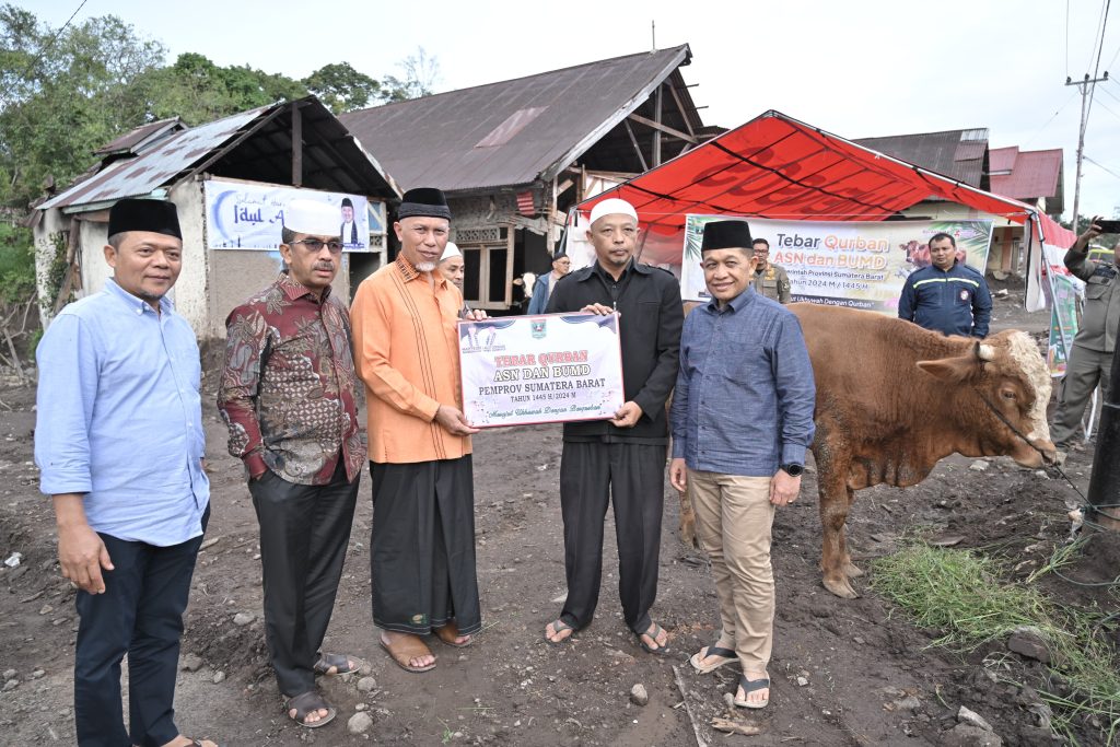 TANAH DATAR, PARADISO INDONESIA -Gubernur Sumatera Barat (Sumbar) Mahyeldi Ansharullah, menyerahkan bantuan sapi qurban dalam kegiatan Tebar Qurban ASN dan BUMD Pemprov Sumbar di Nagari Parambahan, Lima Kaum, Kabupaten Tanah Datar, yang merupakan salah satu kawasan terdampak bencana, Selasa (18/06/2024). Gubernur menyatakan, ibadah qurban adalah salah satu wujud kepedulian sosial di tengah kehidupan bermasyarakat.