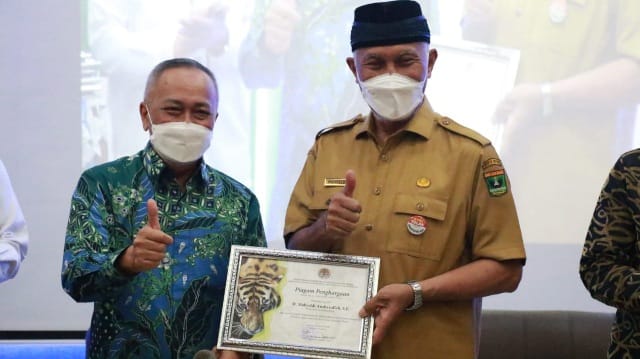 PADANG|PARADISO.CO.ID – Gubernur Sumatera Barat, Buya Mahyeldi menerima penghargaan dari Kementerian Kehutanan dan Lingkungan Hidup atas peran serta dukungannya terhadap konservasi Harimau Sumatra. Penghargaan tersebut diterima Gubernur dari Dirjen Konservasi Sumber Daya Alam dan Ekosistem KemenLHK, Wiratno, dalam Seminar Nasional dengan tema “Masa Depan Harimau Sumatra” di Universitas Andalas, Senin (14/2/2022).