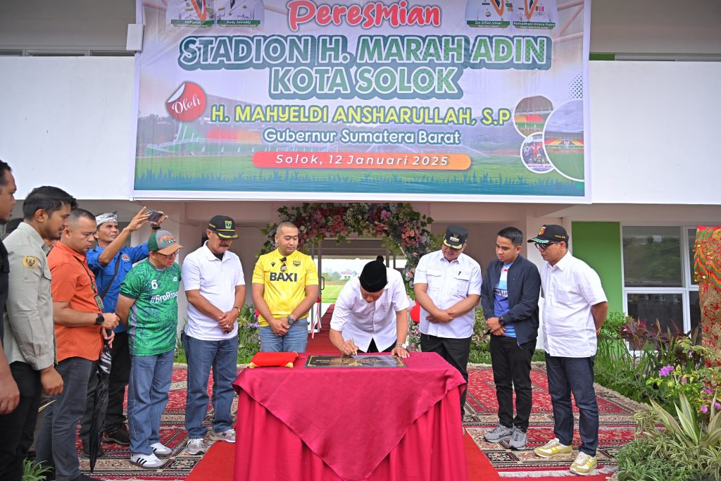 SOLOK, PARADISO INDONESIA – Gubernur Sumatera Barat (Sumbar), Mahyeldi Ansharullah, meresmikan Stadion H. Marah Adin di Kota Solok, Minggu (12/1/2025). Peresmian stadion yang menggunakan nama tokoh sekaligus Kakek Buyut Wagub Sumbar Audy Joinaldy tersebut, ditandai dengan penandatanganan prasasti serta gelaran pertandingan persahabatan antara kesebalasan Pemprov Sumbar menghadapi kesebelasan Pemko Solok.