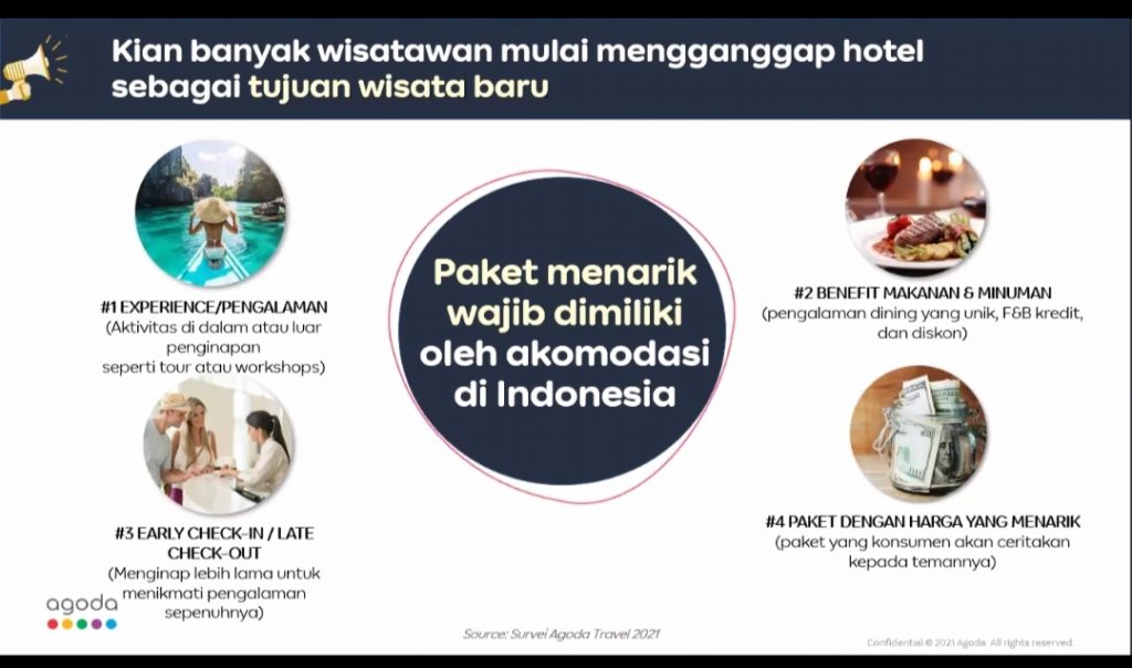 “Sebelumnya, hotel adalah basis wisatawan untuk menjelajahi wilayah lokal, terutama bagi wisatawan mancanegara. Kini, dengan pengunjung domestik dan perjalanan staycation mendominasi rencana perjalanan, orang ingin meningkatkan pengalaman akomodasi karena mereka mungkin lebih banyak menghabiskan waktu di hotel, dan mencari hotel yang menyediakan hiburan. Baik itu aktivitas tambahan atau sekadar kemewahan tambahan seperti makanan dan minuman, atau paket spa, atau benefit untuk late check out, cara orang menikmati liburan kini sudah berubah. Dan Agoda membantu pelanggan menemukan penawaran terbaik dengan produk Agoda Special Offers yang baru untuk membantu pelanggan mendapatkan pengalaman perjalanan yang lebih memuaskan dengan nilai terbaik saat mereka terus melakukan perjalanan hyperlocal,” ucap Gede Gunawan, Senior Country Director, Indonesia, Agoda saat jumpa media secara daring, Selasa (7/9/2021).