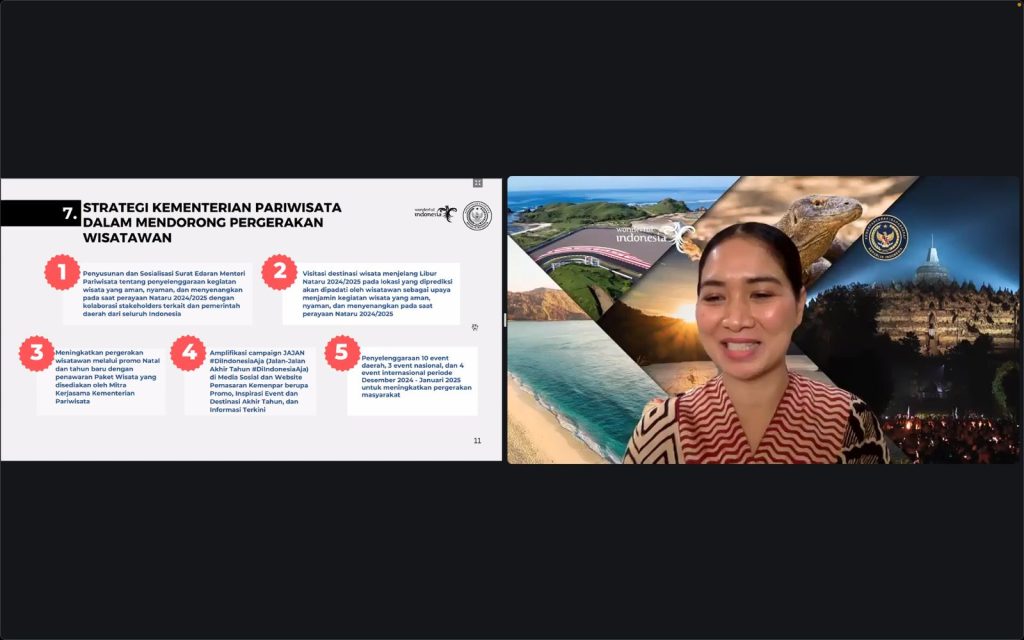 Strategi mencakup penyusunan dan sosialisasi Surat Edaran Menteri Pariwisata tentang penyelenggaraan kegiatan wisata yang aman, nyaman, dan menyenangkan pada saat perayaan Natal 2024 dan tahun baru 2025 dengan kolaborasi stakeholder terkait dan pemerintah daerah seluruh Indonesia.