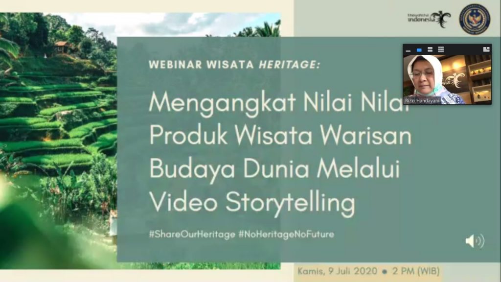 Deputi Bidang Produk Wisata dan Penyelenggaraan Kegiatan (Events) Kemenparekraf/Baparekraf, Rizki Handayani, saat Webinar Wisata Heritage bertema “Mengangkat Nilai-Nilai Produk Wisata Warisan Budaya Dunia melalui Video Storytelling” Kamis, (8/7/2020), mengatakan sangat penting bagi pelaku pariwisata untuk dapat mengangkat nilai-nilai atau daya tarik destinasi wisata yang ada di setiap daerah. Salah satunya dengan penceritaan visual melalui Video Storytelling.
