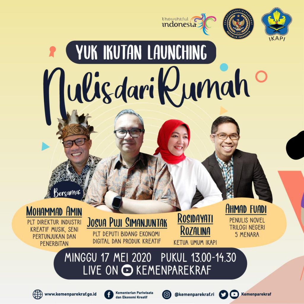 Pada saat Virtual Bincang Kreatif dan Launching Nulis dari Rumah hadir pula sebagai moderator Plt. Direktur Industri Kreatif Musik, Seni Pertunjukan dan Penerbitan Mohammad Amin, Penulis Novel Trilogi Negeri 5 Menara Ahmad Fuadi dan Ketua Ikatan Penerbit Indonesia (IKAPI) Rosidayati Rosalina.