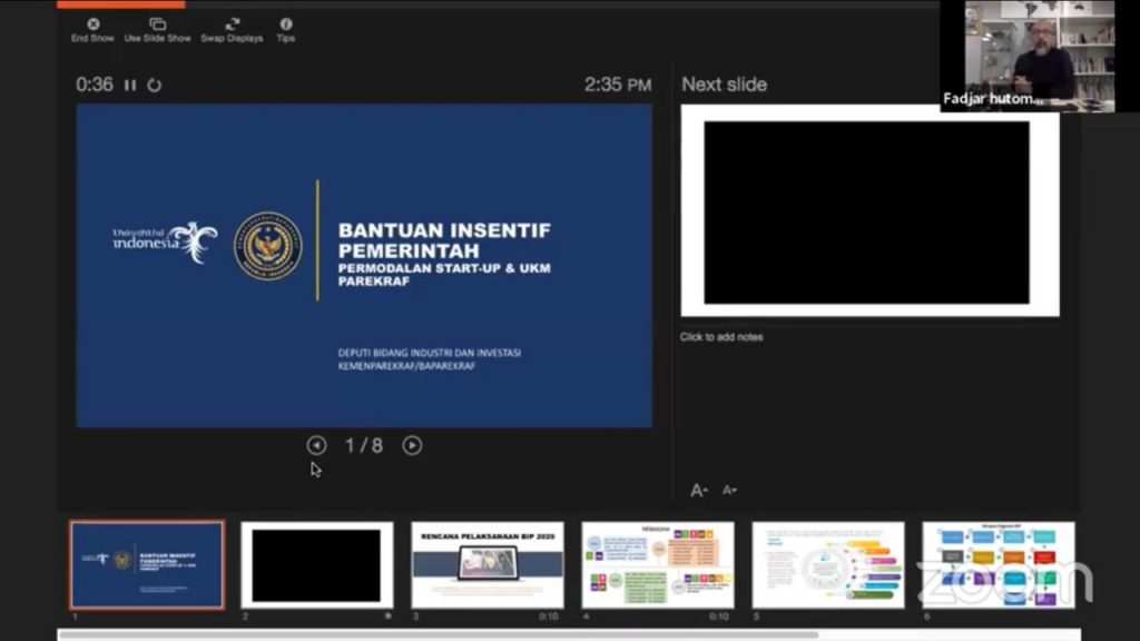 Deputi Bidang Industri dan Investasi Kemenparekraf/Baparekraf Fadjar Hutomo dalam webinar “Penyediaan dan Akses Permodalan bagi UMKM di Sektor Pariwisata dan Ekonomi Kreatif”, Jumat (12/6/2020) mengatakan, BIP merupakan program yang telah dijalankan Badan Ekonomi dan Kreatif (Bekraf) sejak 2017 dan kembali dilanjutkan tahun ini seiring meleburnya Bekraf dalam Kementerian Pariwisata dan Ekonomi Kreatif.
