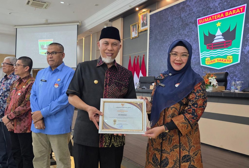 PADANG — Kamis, 7 Agustus 2025, menjadi momen istimewa bagi jajaran Biro Organisasi Sekretariat Daerah Provinsi Sumatera Barat. Dalam acara Rapat Pimpinan Organisasi Perangkat Daerah (OPD) Lingkup Pemerintah Provinsi Sumatera Barat yang digelar di Auditorium Gubernuran, Kepala Biro Organisasi Dina Febriyanti, SE., M.Si menerima dua piagam penghargaan prestisius yang diserahkan langsung oleh Gubernur Sumatera Barat Buya Mahyeldi.