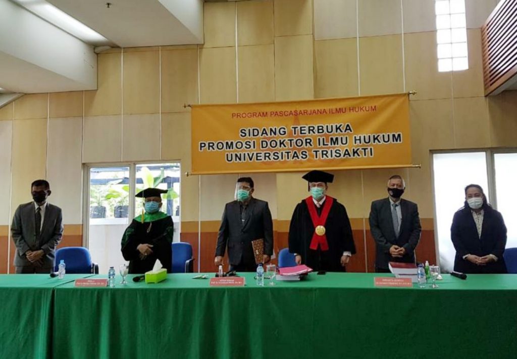 Sidang ujian terbuka promosi Doktor Ilmu Hukum yang berlangsung dengan hikmat, dilakukan berdasarkan aturan yang berlaku di Universitas Trisakti, terkait masa pandemik covid-19 ini, hanya boleh dihadiri 10 orang pengunjung.