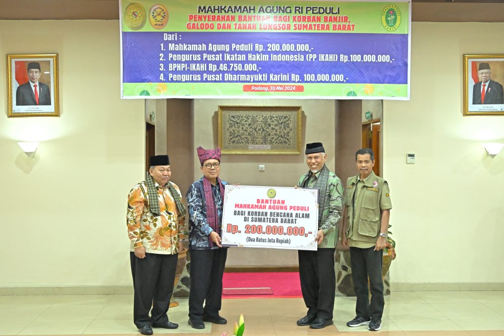 “Kemudian, ada bantuan dari PP Pengurus Pusat Ikatan Hakim Indonesia (IKAHI) senilai Rp100 juta yang diserahkan kepada PD IKAHI Sumbar, serta bantuan sebesar Rp100 juta dari Pengurus Pusat Dharmayukti Karini. Bantuan ini tentu saja bentuk belasungkawa kita atas bencana yang merenggut banyak nyawa dan mengakibatkan rusaknya infrastruktur di Sumbar,” ujar Syarifuddin.