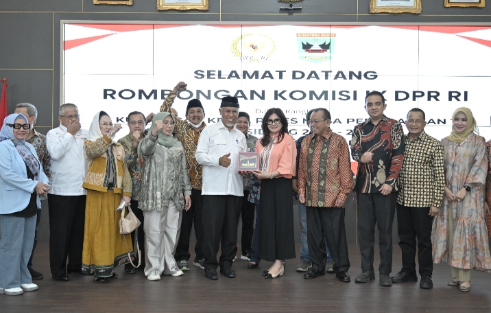 PADANG, PARADISO INDONESIA –Gubernur Sumatera Barat (Sumbar), Mahyeldi Ansharullah beserta jajaran menyambut kedatangan rombongan kunjungan kerja Komisi IX DPR RI ke Sumbar, di Auditorium Gubernuran, Rabu (04/10/2023). Dalam pertemuan tersebut, Gubernur memaparkan situasi seputar kesehatan, ketenagakerjaan, pengawasan obat dan makanan, hingga pelaksanaan Jaminan Kesehatan Nasional (JKN) di Sumbar. Dalam sambutannya, Gubernur Mahyeldi mengungkapkan terima kasih atas kunjungan kerja (kunker) rombongan Komisi IX DPR RI. Serta, atas dukungan yang diberikan DPR RI untuk setiap upaya pengembangan kualitas pelayanan bagi masyarakat dan pembangunan fisik/nonfisik di Sumbar. “Termasuk yang kita terima, dukungan dari Kementerian Kesehatan untuk Rumah Sakit Achmad Mochtar senilai Rp143 miliar. Ini sangat penting bagi kita untuk memenuhi kebutuhan pelayanan rujukan bagi masyarakat Sumbar, khususnya yang tinggal di bagian utara, yang aksesnya cukup jauh menuju RSUP Dr. M. Djamil,” ucap Gubernur. Selain itu, Gubernur juga menerangkan, bahwa salah satu fokus Sumbar di sektor kesehatan adalah penanganan stunting. Di mana, sejauh ini persentase stunting Sumbar berada di angka 10,6 persen. Sementara di sisi lain, Presiden Joko Widodo meminta agar persentase stunting pada tahun 2024 berada di angka 14 persen. “Artinya, Sumbar di tahun ini sudah memenuhi target yang diharapkan Bapak Presiden untuk tahun depan. Bahkan sudah bisa menekan stunting hingga 10,6 persen,” ucap Gubernur lagi. Dalam kesempatan reses tersebut, Gubernur beserta jajaran dinas dan lembaga terkait selaku mitra kerja Komisi IX DPR RI, bergantian memaparkan rincian kondisi kesehatan dan ketenagakerjaan di Sumbar. Menanggapi paparan tersebut, silih berganti jajaran Anggota DPR RI dari Komisi IX yang hadir dalam rombongan kunker, menyampaikan beberapa pertanyaan untuk memperdalam informasi dari aparatur terkait. “Kami berharap seluruh jawaban dan penjelasan atas pertanyaan pendalaman yang diajukan, dapat disampaikan secara tertulis nantinya,” ucap Ketua Tim Kunker Komisi IX DPR RI, Nihayatul Mafiroh, yang juga selaku Wakil Ketua Komisi IX DPR RI.**” (adpsb / H )
