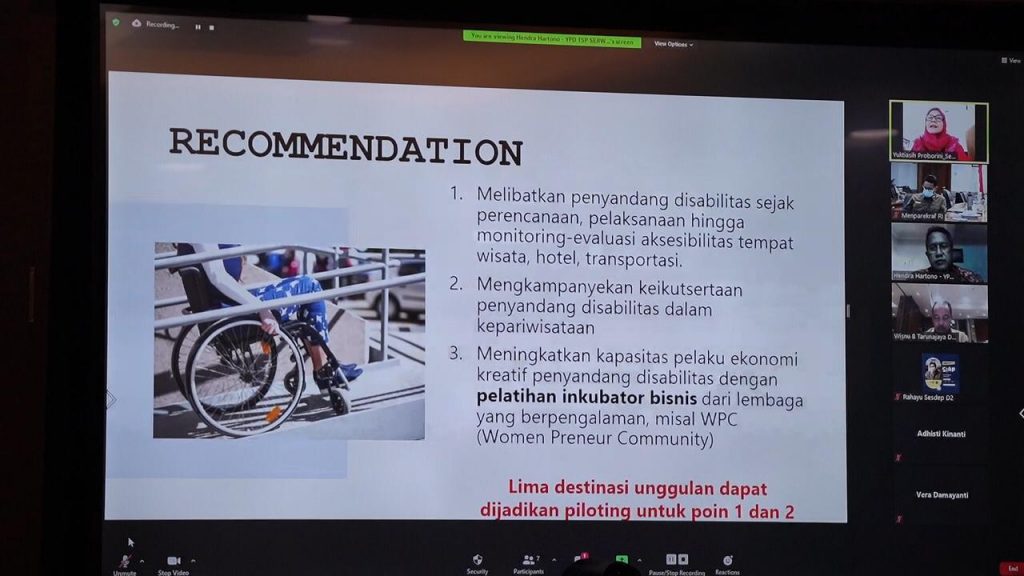 Pada kesempatan yang sama, Aktivis Penyandang Disabilitas Yuktiasih Proborini memberikan rekomendasi dan masukan kepada Kemenparekraf agar melalui program-programnya dapat berkolaborasi melibatkan para penyandang disabilitas.