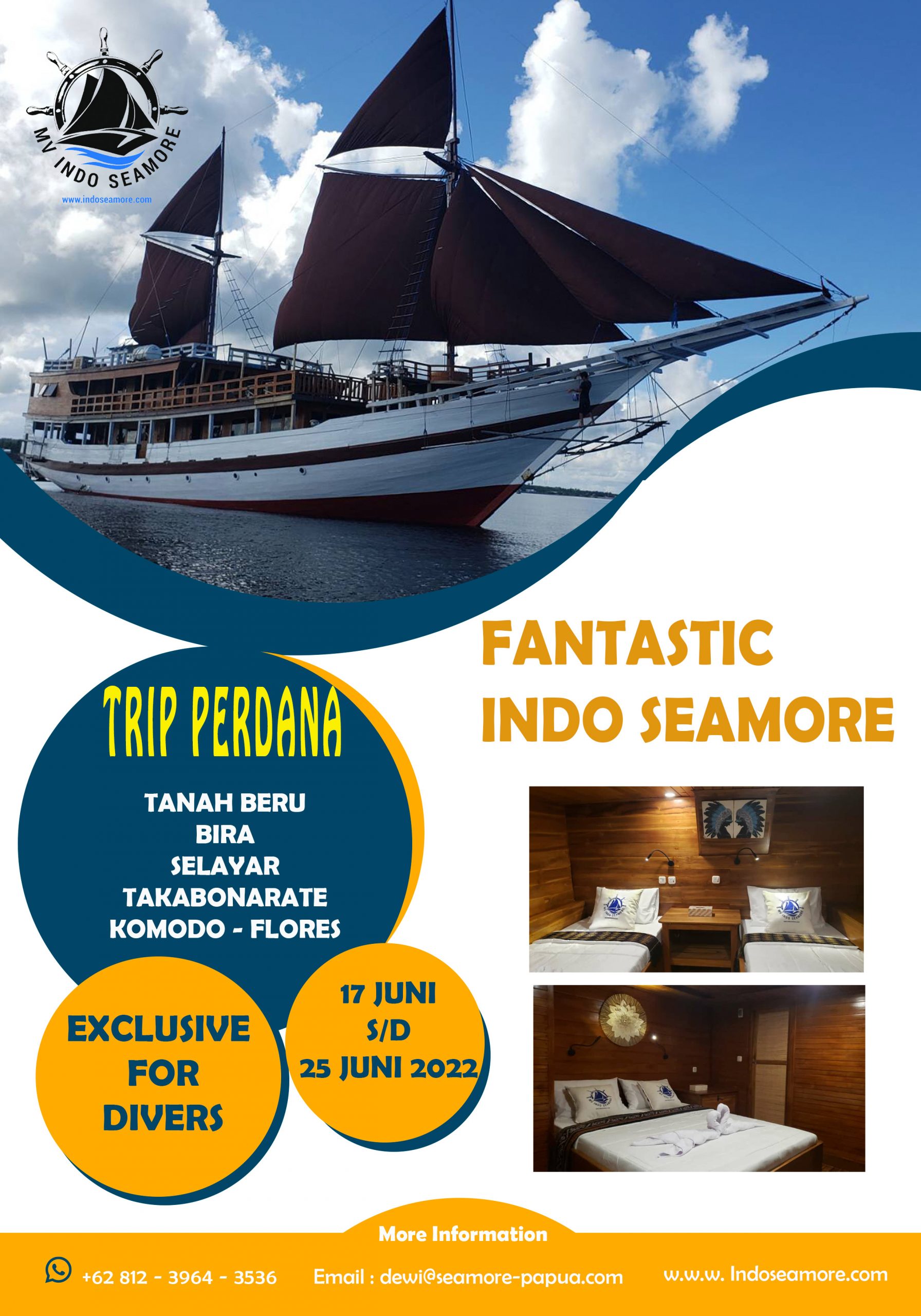 Seperti diketahui kapal pinisi INDO SEAMORE sudah selesai dibangun dan kini tinggal menunggu jadwal berlayar perdananya. Kapal pinisi dengan bobot kurang lebih 300 ton ini akan membawa sejumlah divers berpengalaman untuk melihat dan mengalami indahnya bawah laut di Kepulauan Selayar. Usai dari Kepulauan Selayar, INDO SEAMORE akan menuju ke Bira, Takabonerate hingga destinasi terakhirnya adalah Komodo – Labuan Bajo. Trip ini diperkirakan makan waktu kurang lebih 10 hari yang dikemas dalam fun diving untuk menikmati keindahan bawah laut kawasan-kawasan wisata tersebut hingga mengupdate kembali produk – produk unggulan bawah laut yang ingin ditawarkan kepada wisatawan maupun para divers.