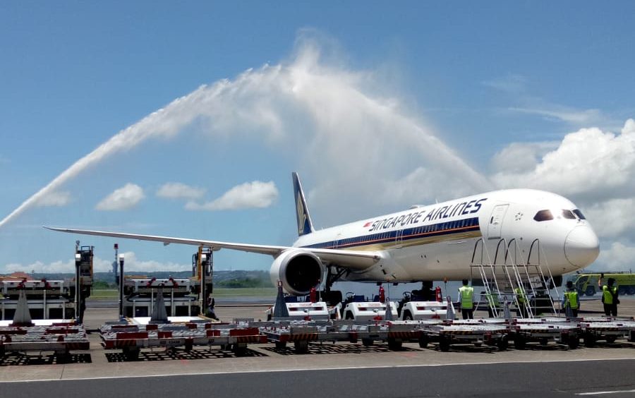 SIA merupakan maskapai penerbangan asing berjadwal pertama yang terbang ke Bali setelah pemerintah Indonesia membuka perbatasan Bali untuk turis mancanegara. Setibanya di Bandara I Gusti Ngurah Rai, pesawat dengan nomor penerbangan SQ 938 ini disambut dengan water cannon salute.