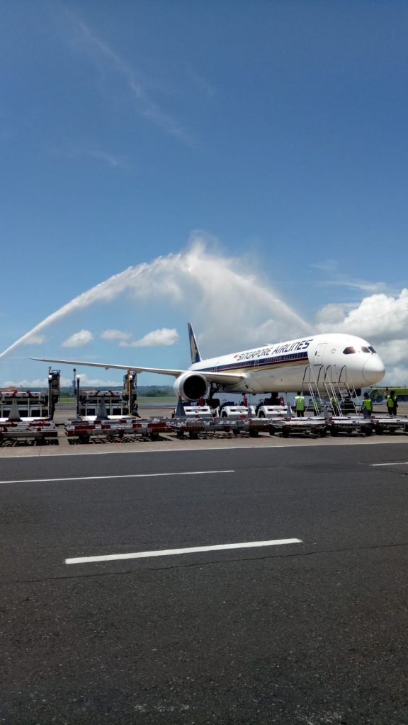 SIA merupakan maskapai penerbangan asing berjadwal pertama yang terbang ke Bali setelah pemerintah Indonesia membuka perbatasan Bali untuk turis mancanegara. Setibanya di Bandara I Gusti Ngurah Rai, pesawat dengan nomor penerbangan SQ 938 ini disambut dengan water cannon salute.