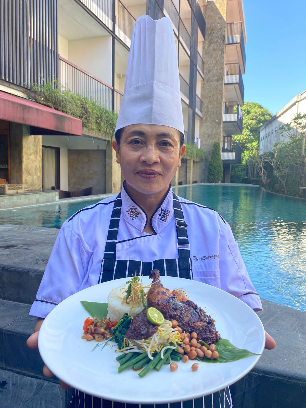 Chef Desak Ketut Darmayanti dan menu ayam bakar spesial yang jadi andalan di Quest Hotel Kuta. FOTO – IST.