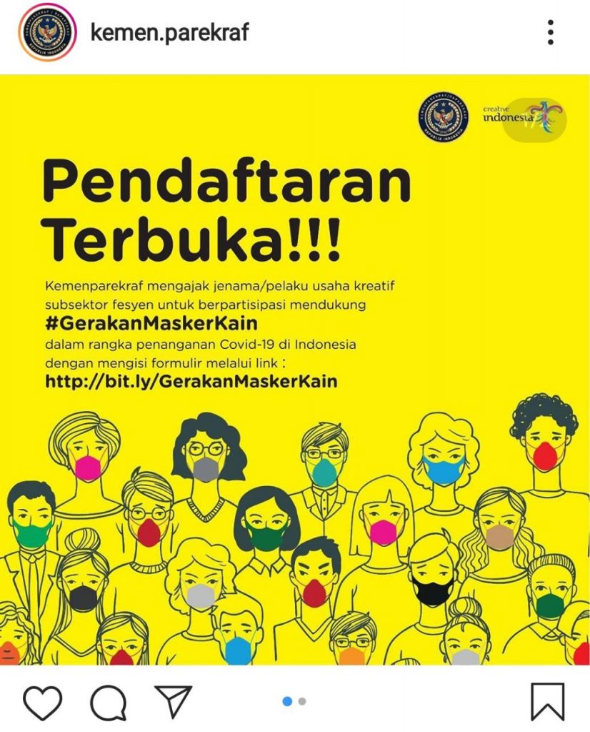 Hal ini kemudian mendorong Kemenparekraf berinisiatif untuk mengajak para pekerja fesyen agar menggerakkan usahanya dengan membuat masker kain dari kain perca atau sisa bahan kain produksi mereka.