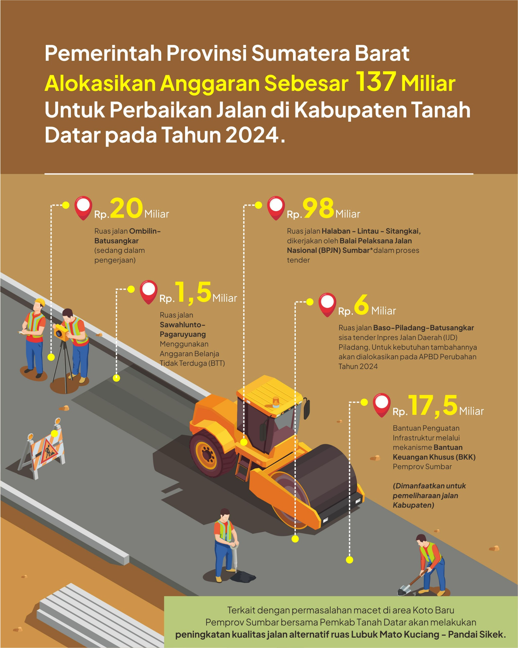 Anggaran itu meliputi ruas jalan ombilin baru sangkar sebesar Rp20 miliar sedang dalam pengerjaan. Ruas jalan Halaban, Lintau, Setangkai dikerjakan oleh Balai Pelaksana Jalan Nasional (BPJN) Sumbar sebesar sebesar Rp98 miliar.