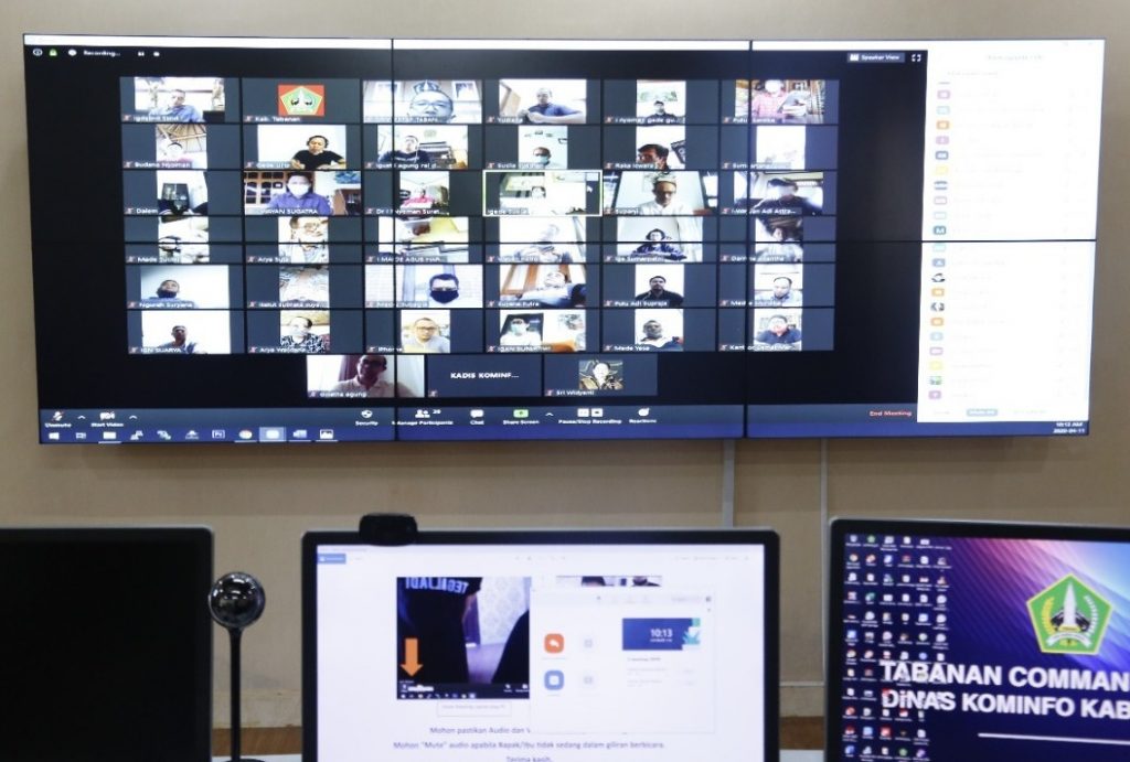 Tabanan (Paradiso) – Gugus Tugas Percepatan Penanganan Corona Virus Disease (Covid-19) Kabupaten Tabanan yang dipimpin langsung Ketua Gugus Tugas I Gede Susila, melakukan rapat bersama OPD di lingkungan Pemkab Tabanan melalui video vonference, Sabtu (11/4).