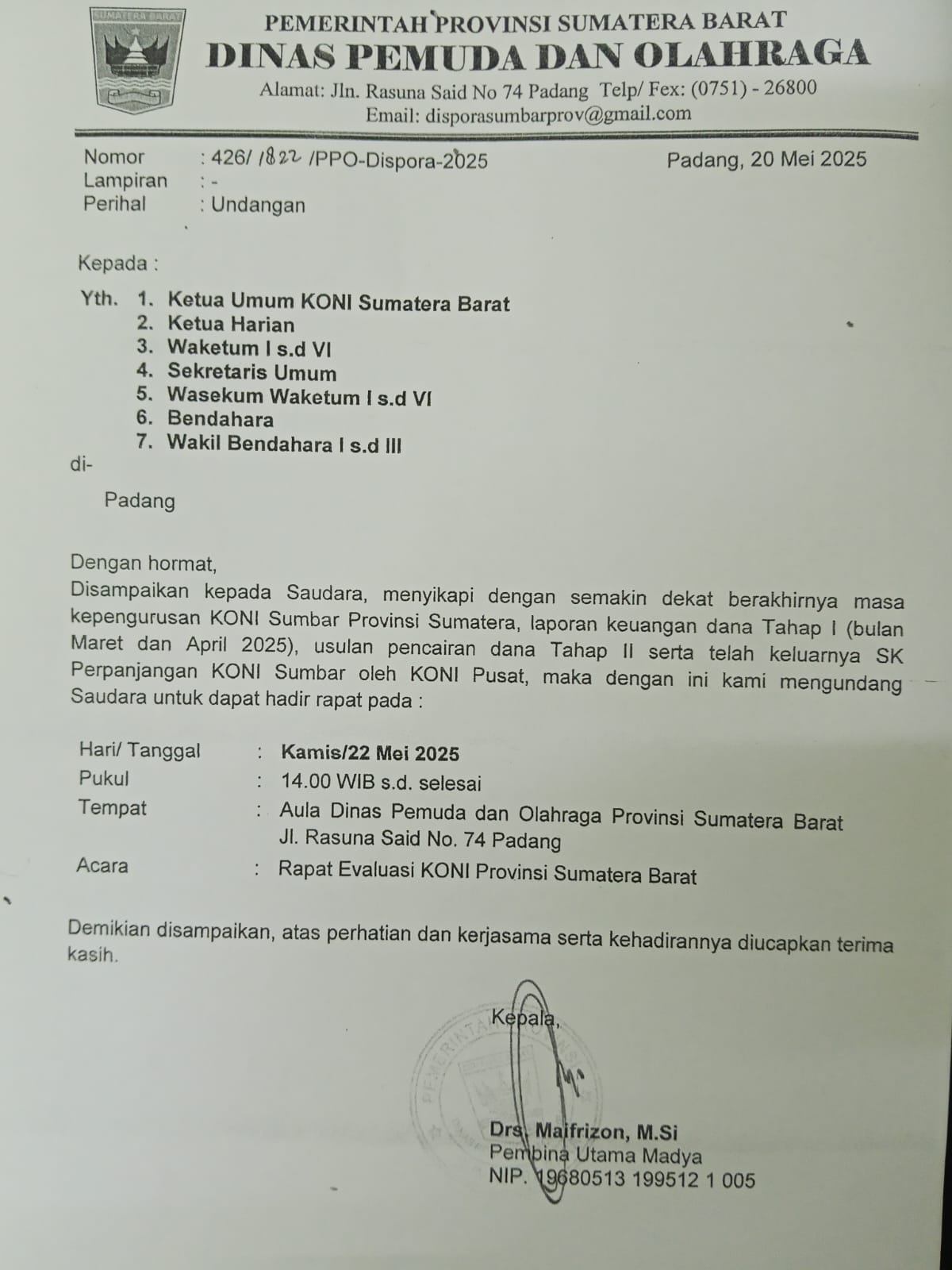 Buktinya, Dispora Sumbar melayangkan surat undangan rapat kepada Pengurus KONI Sumbar tanggal 20 Mei 2025 melalui surat No 426/1822/PPO-Dispora-2025 yang ditandatangani langsung oleh Kadispora Sumbar Maifrizon.