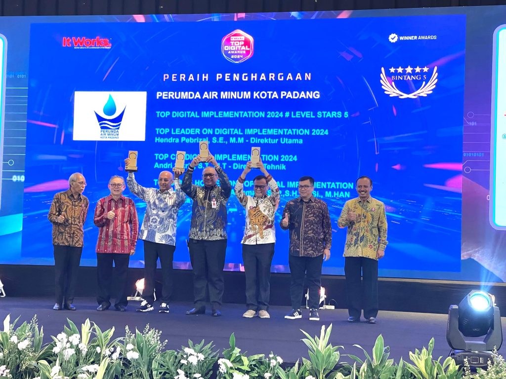 Di ajang penghargaan bergengsi ini, Perumda Air Minum Kota Padang dicatat meraih 4 penghargaan sekaligus. Pertama, Top Digital Implementation 2024 # Level Stars 5. Kedua, Top Leader on Digital Implementation 2024 atas nama Direktur Utama Perumda Air Minum Kota Padang Hendra Pebrizal, S.Sos, M.M. Ketiga, Top CIO on Digital Implementation 2024 atas nama Direktur Tehnik Andri Satria, S.T., M.T, Keempat, Top Stake Holder on Digital Implementation 2024 atas nama PJ. Walikota Padang Dr. H. Andree Harmadi Algamar, SSTP SH, MSi. M.HAN.