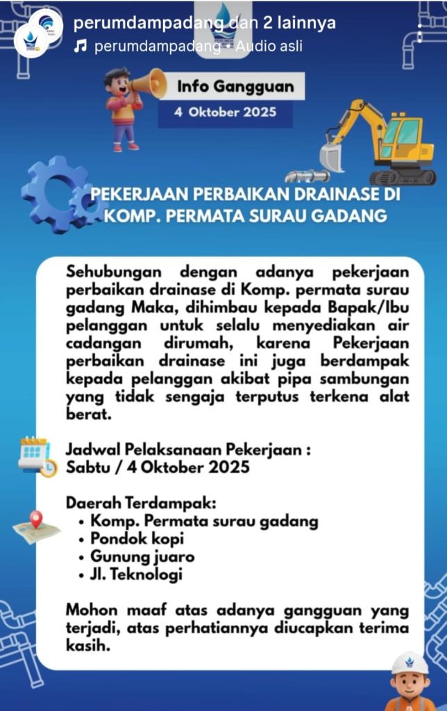 “Sehubungan dengan adanya pekerjaan perbaikan drainase di Komplek Permata Surau Gadang, dihimbau kepada Bapak/Ibu pelanggan untuk selalu menyediakan air cadangan di rumah. Pekerjaan ini juga berdampak kepada pelanggan akibat pipa sambungan yang tidak sengaja terputus terkena alat berat,” tulis pihak Perumda Air Minum Padang dalam pengumuman resmi.