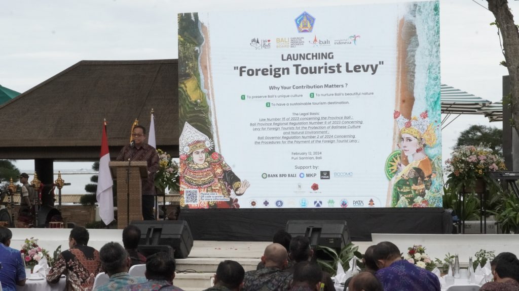 DENPASAR, PARADISO INDONESIA – Penjabat (Pj) Gubernur Bali S.M. Mahendra Jaya meluncurkan program Pungutan Wisatawan Asing (PWA) untuk Pelindungan Kebudayaan dan Lingkungan Alam Bali, Senin (12/2/2024). Peluncuran program PWA yang digelar di Hotel Puri Santrian Sanur, ditandai aksi mengarahkan telapak tangan ke layar LED oleh Pj. Gubernur Bali yang diikuti Kadisparda Bali Tjokorda Bagus Pemayun, Ketua Gabungan Industri Pariwisata Indonesia (GIPI) Bali Ida Bagus Agung Partha Adnyana, Ketua Badan Promosi Pariwisata Daerah (BPPD) Provinsi Bali yang juga sekaligus selaku Ketua PHRI Bali Prof.Tjokorda Oka Artha Ardhana Sukawati, Dirut PT. BPD Bali Nyoman Sudharma dan Kepala Perwakilan BI Provinsi Bali R. Erwin Soeriadimadja.