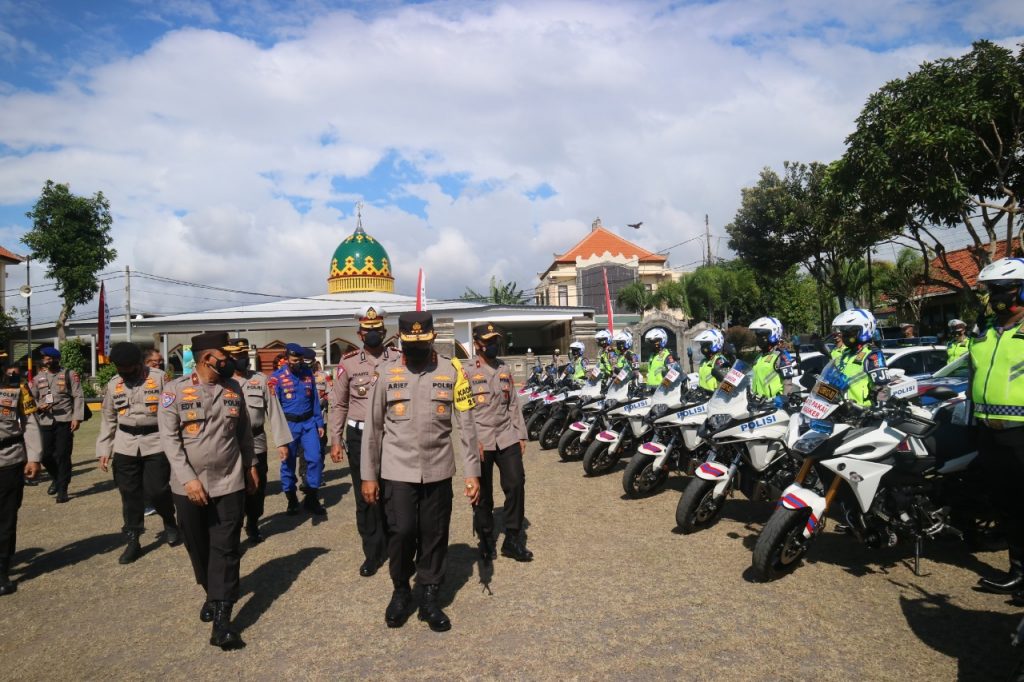 Apel gelar sarana prasarana pengamanan digelar di Lapangan Brimob Polda Bali, Kamis (30/9/2021). Dalam acara tersebut digelar berbagai sarana persiapan pengamanan yang akan digunakan dalam tiga event di Nusa Dua Bali. Ikut berpartisipasi dalam acara tersebut sebanyak 361 orang personil dari semua satuan dengan total peralatan hampir 200 unit.