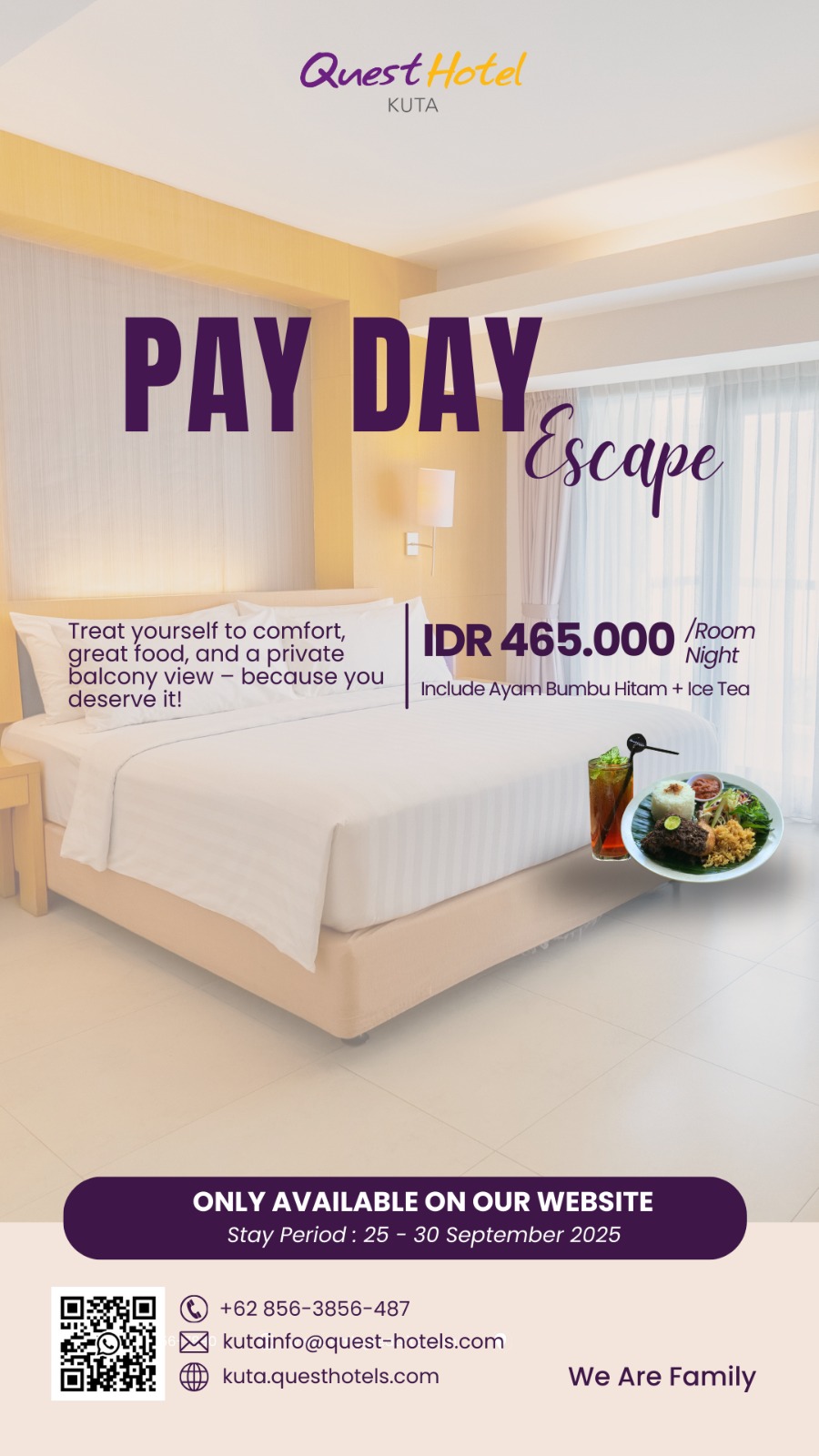 KUTA  – Menyambut momen gajian, Quest Hotel Kuta menghadirkan promo spesial bertajuk “Pay Day Escape”. Penawaran ini menjadi cara unik bagi masyarakat untuk merayakan hasil kerja keras dengan sedikit memanjakan diri.