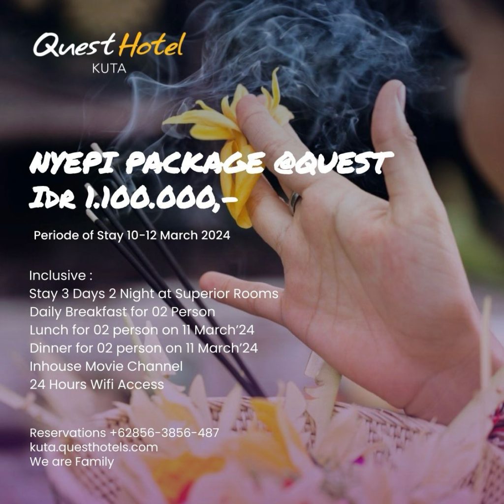 Quest Hotel Kuta menyediakan paket Nyepi pada periode 10-12 Maret 2024 dengan harga mulai dari Rp 1.100.000 net/room/night, type kamar Superior Room dengan inclusive stay 3 hari 2 malam, termasuk sarapan pagi untuk 2 orang, Lunch dan Dinner pada saat nyepi 11 March 2024, serta Wifi Access 24 jam dan Inhouse Movie Channel.