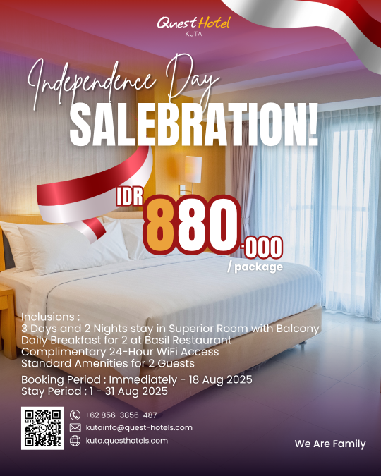 Dengan lokasi strategis dekat Bandara Internasional I Gusti Ngurah Rai, fasilitas nyaman, dan pelayanan ramah, Quest Hotel Kuta siap menjadi pilihan tepat untuk menghabiskan bulan Agustus dengan penuh keceriaan dan rasa bangga akan kemerdekaan.