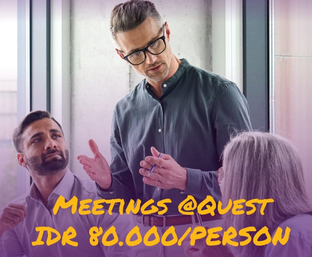 Kali ini Quest Hotel Kuta menawarkan paket meeting yang super lengkap dibanderol seharga Rp. 80.000nett/orang, minimal 20 orang, dengan fasilitas inclusive Coffee Tea and Snack, sound system, microphone, LCD Proyektor, HDMI Cable, Wifi Access dan stage.