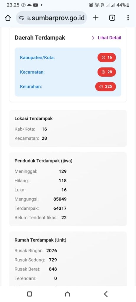 Data dari Posko Terpadu Penanggulangan Bencana Sumbar mencatat 131 personel dikerahkan untuk menangani dampak banjir, galodo, sedimentasi sungai, serta kerusakan saluran irigasi.