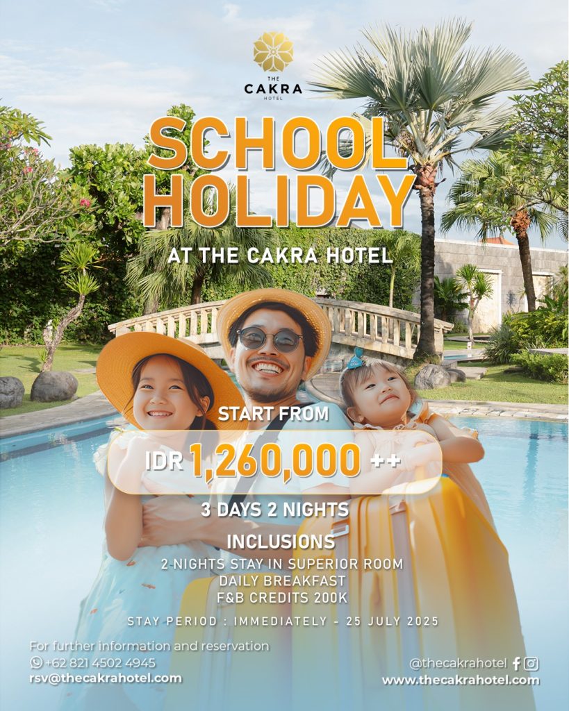 DENPASAR, PARADISO INDONESIA – Momen liburan sekolah adalah waktu yang tepat untuk mempererat kebersamaan keluarga, dan The Cakra Hotel siap menjadi destinasi ideal untuk staycation yang menyenangkan. Dengan penawaran menginap selama 3 hari 2 malam di Superior Room, mulai dari Rp1.260.000, tamu sudah dapat menikmati sarapan untuk dua orang, food & beverage credit sebesar Rp 200.000 selama masa menginap, serta akses ke beragam fasilitas hotel yang menunjang kenyamanan dan keseruan liburan.