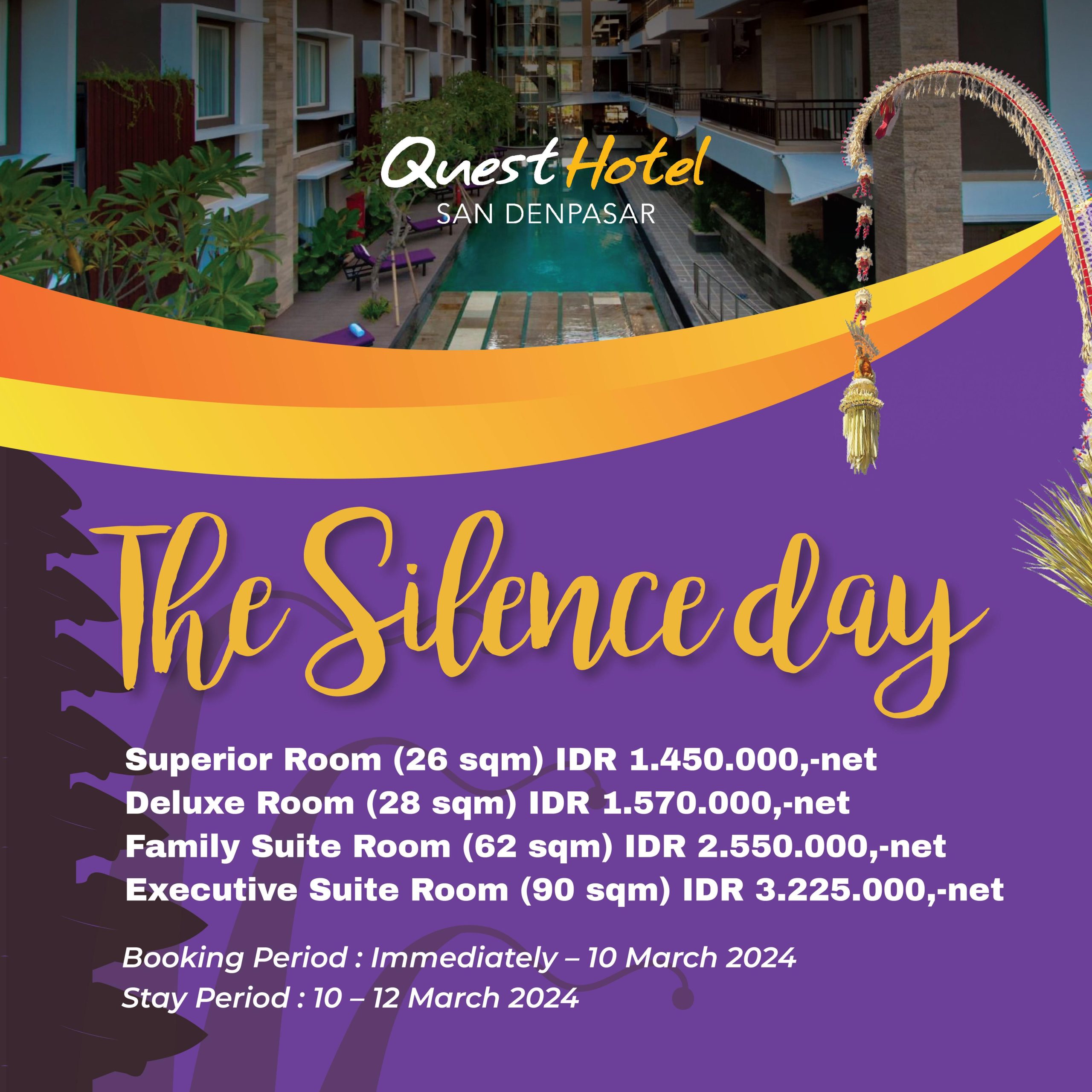 “Paket ‘The Silence of The Day 2024’ kami dirancang untuk memastikan bahwa tamu kami dapat merayakan Nyepi dengan damai dan nyaman. Kami menyediakan berbagai fasilitas dan layanan yang akan membuat pengalaman menginap Anda di Quest San Hotel Denpasar menjadi tak terlupakan,” ujar Citra Pertiwi.