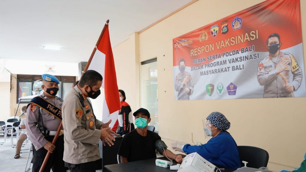 Sebanyak 100 warga Kota Denpasar datang ke Mako Polresta Denpasar untuk melaksanakan vaksinasi. Sebelum dilaksanakan vaksinasi, Kapolresta Denpasar bersama petugas vaksin dan peserta vaksin menyanyikan lagu Indonesia Raya serta mengibarkan bendera Merah Putih. Kapolresta Denpasar juga mengajak seluruh warga untuk tetap semangat berjuang melawan pandemi Covid-19 dengan mengiibarkan bendera Merah Putih serta menyuarakan Semangat Kemerdekaan.