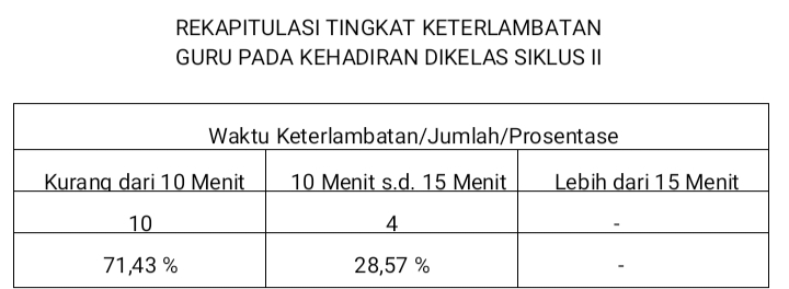 Dari hasil observasi dan data yang  diperoleh,  peneliti mengambil kesimpulan bahwa tindakan yang dilaksanakan pada siklus kedua dinyatakan berhasil, karena terdapat 71,43% guru yang terlambat kurang dari 10 menit, atau melebihi target yang telah ditentukan sebesar 65 %.
