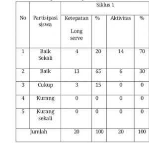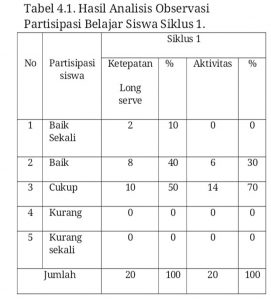 Selanjutnya dikoreksi dan dinilai hasil tindakan pada siklus 1.Sebagai hasil dari observasi tersebut, peneliti membuat suatu kesimpulan. Hasil pengamatan dan diskusi diperoleh bahwa persentase penguasaan teknik dasar servis panjang dalam permainan bulu tangkis pada siklus 1 sebesar 60% dikategorikan cukup, dan persentase tersebut tidak mencapai criteria 72%, sehingga perlu dilakukan tindakan pada siklus 2.