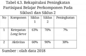 dinyatakan bahwa penguasaan teknik dasar servis panjang dalam permainan bulu tangkis sebelum dan setelah pelaksanaan siklus 1 dan siklus 2 mengalami peningkatan yang cukup berarti. Hal ini dapat dilihat pada persentase rata-rata siklus 1 pada komponen Ketepatan Long Serve yaitu 63% dikategorikan cukup dan pada siklus 2 menjadi 70%, sedangkan pada komponen aktivasi siswa pada siklus 1 yaitu 60% dan pada siklus 2 meningkat menjadi 90%.