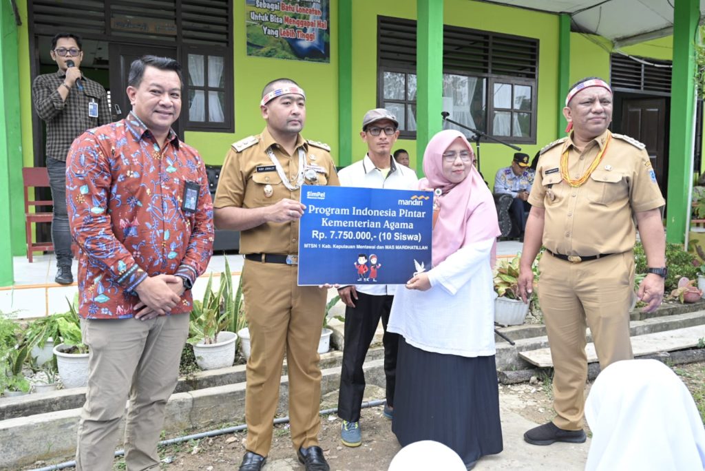 MENTAWAI, PARADISO INDONESIA – Wakil Gubernur Sumatera Barat (Wagub Sumbar), Audy Joinaldy, menyerahkan langsung bantuan Program Indonesia Pintar (PIP) dari Bank Mandiri untuk 10 pelajar di Madrasah Tsanawiyah Negeri (MTsN) 1 Kepulauan Mentawai, Senin, (13/11/2023). Wagub berharap, bantuan tersebut dapat dimanfaatkan sebaik mungkin untuk menunjang kebutuhan pendidikan para penerima manfaat.