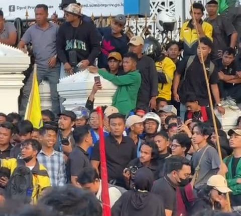 PADANG – Aksi demonstrasi yang digelar di depan Gedung Dewan Perwakilan Rakyat Daerah Sumatera Barat (DPRD Sumbar), Senin (1/9/2025), berlangsung damai.